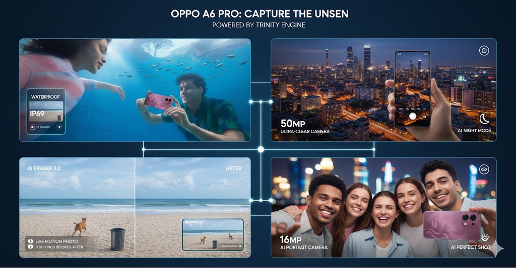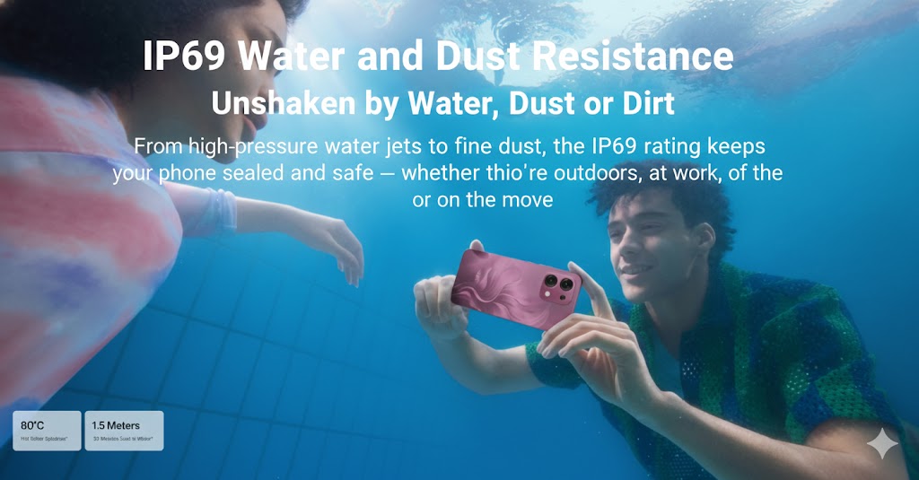 Take your phone anywhere—even underwater. The OPPO A6 Pro boasts an industry-leading IP69 rating, making it resistant to high-pressure hot water jets and total immersion.