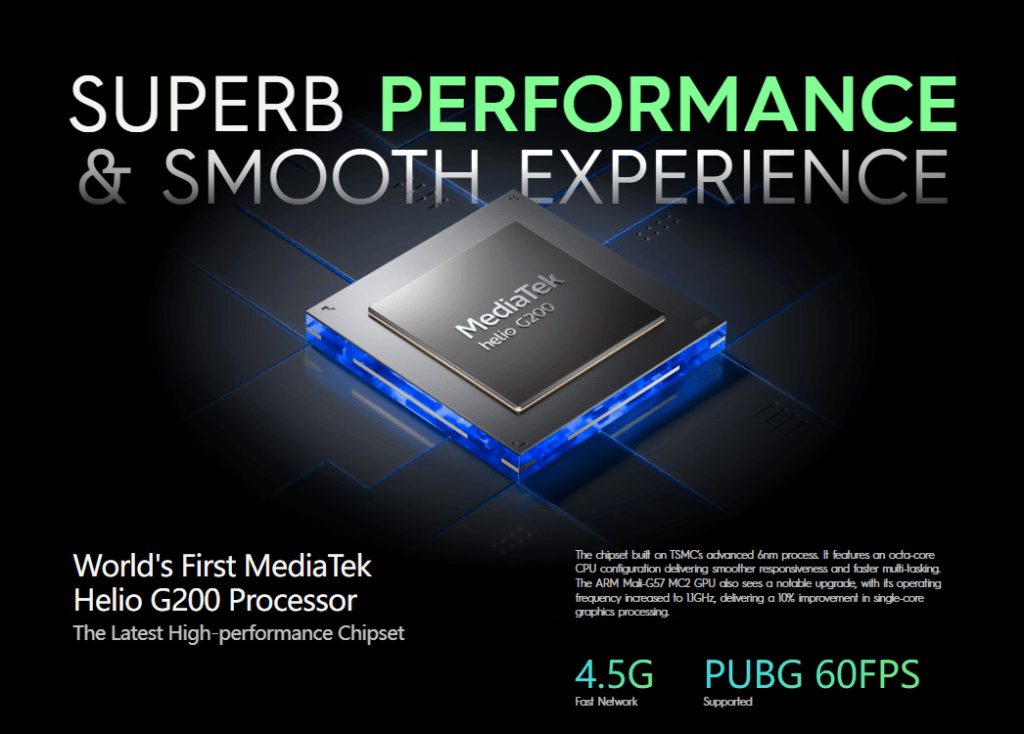 Power meets efficiency. Be the first to experience the MediaTek Helio G200, a chipset built on a 6nm process that delivers lightning-fast multitasking and a 5-year fluency guarantee. Say goodbye to lag and hello to 60FPS gaming on titles like PUBG.